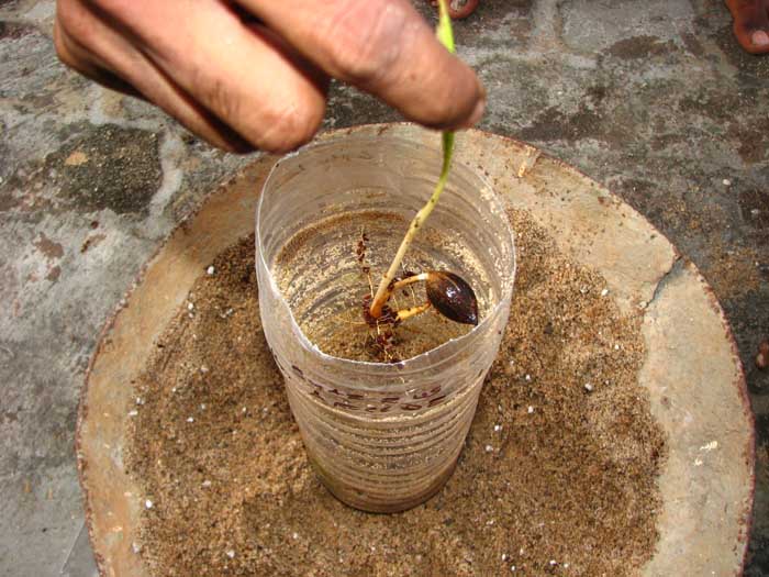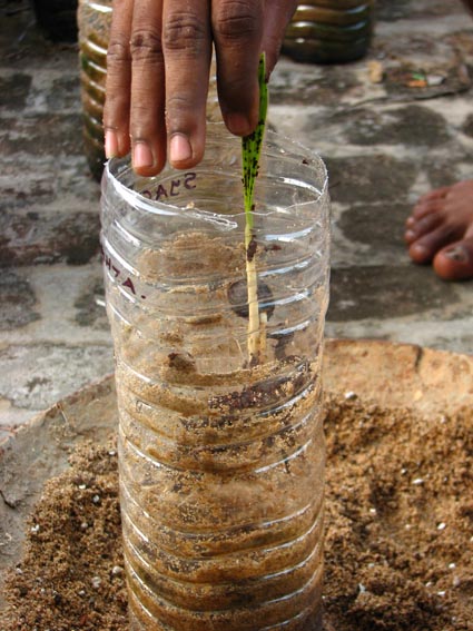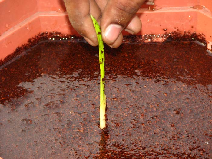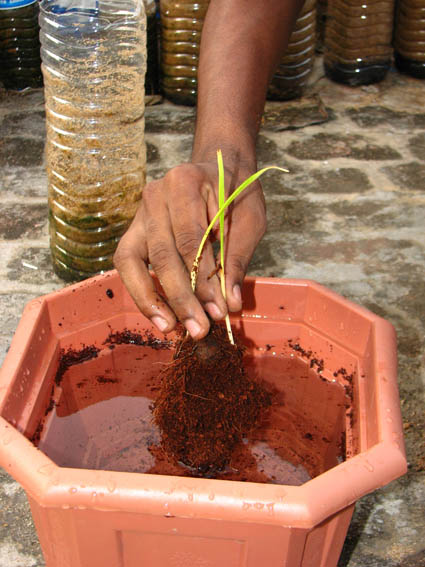 Inspite of our cleaning attempt the coir will still be sticking to the young saplings..so take that palm for a nice dip !