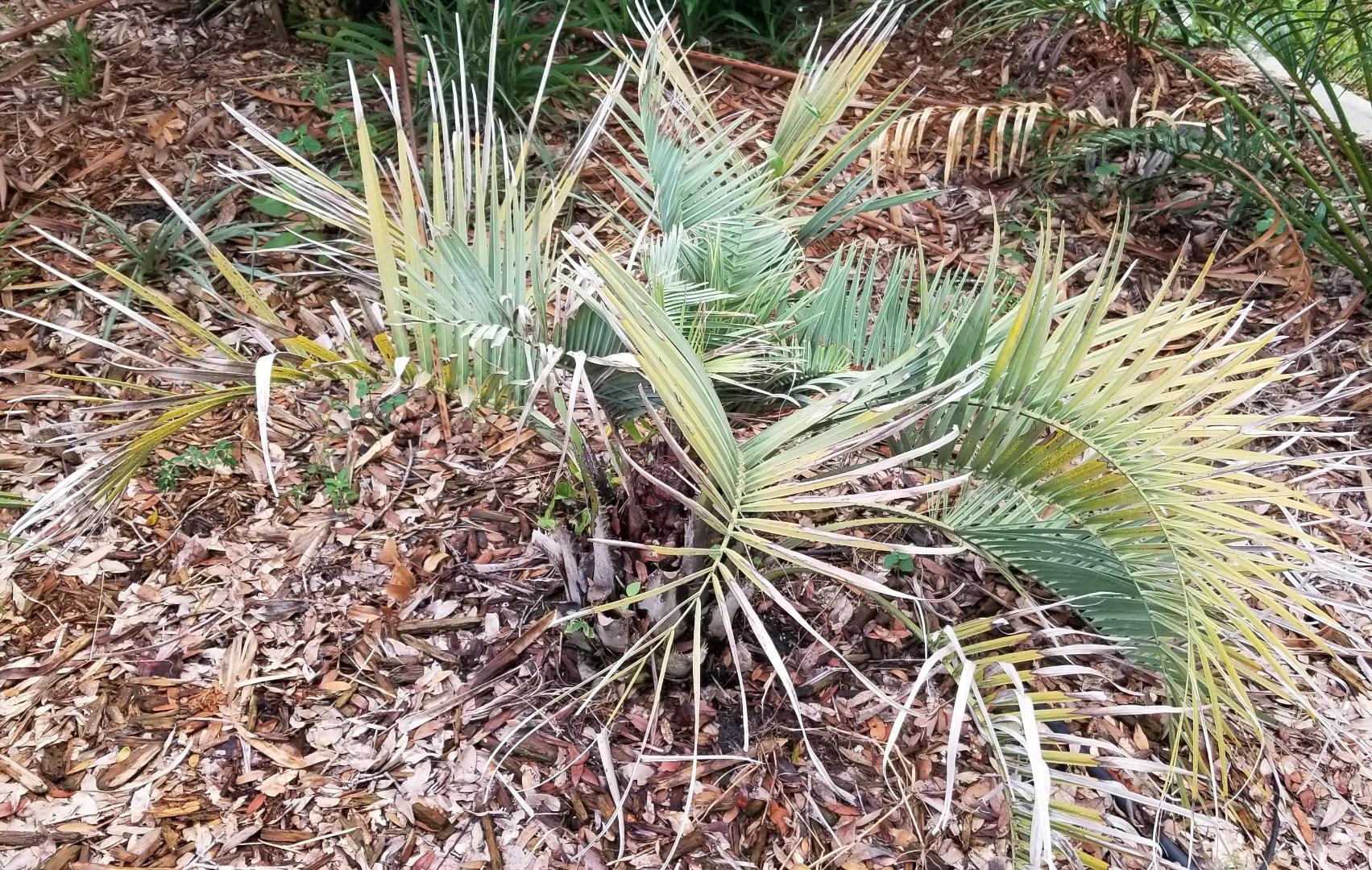 Unfortunately the other one is actually smaller than it was on 7/29/21!  It was getting hit by a lawn sprinkler and got a crown rot in spring 2022, grew out of that with hydrogen peroxide + Daconil, then got a massive mealybug infestation in the crown, grew a spear, got hit by a branch, got another mealybug infestation...it's had a hard life in my yard!!!  😮  It finally opened two new small fronds and I'm going to watch it like a hawk for more mealybugs.  For some weird reason they nested deep in the crown and only ate the new spears.  I hit it with a systemic (either Imadicloprid or Dinotefuran) after doing the soapy water + Malathion treatment.  Maybe by the end of the year it'll have at least a couple of decent fronds?