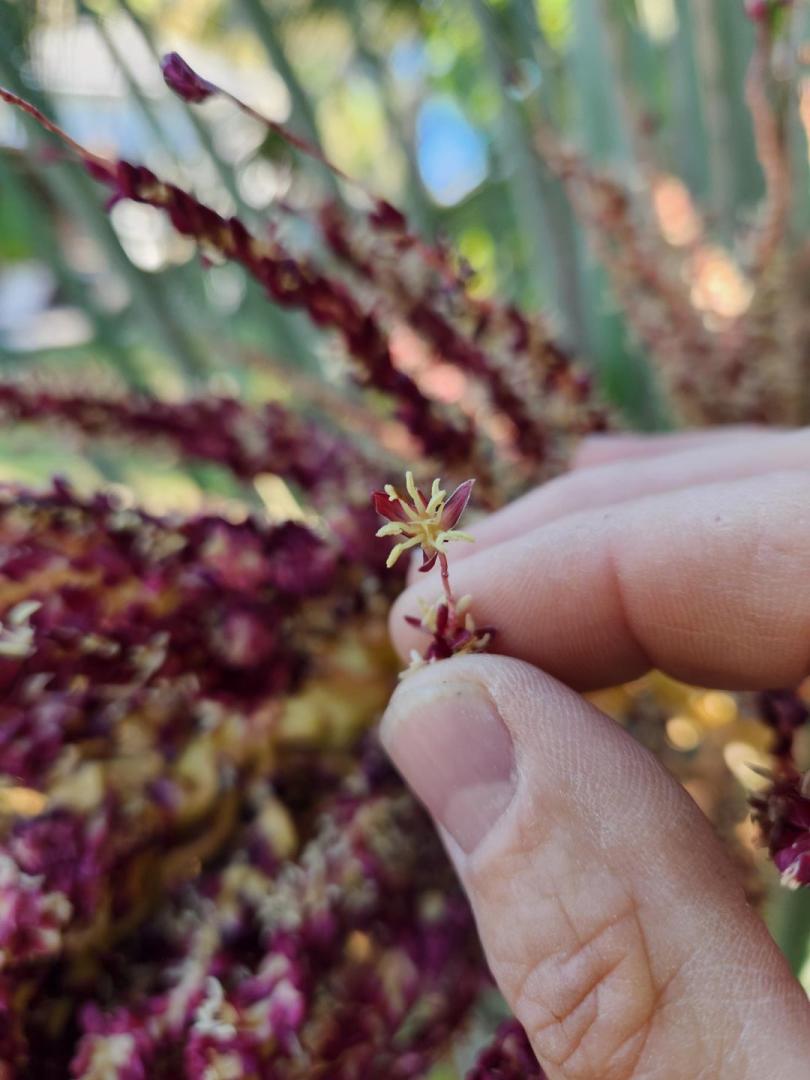 It is also flowering again, this time with 5 spathes, with the first one just opening yesterday.  Close inspection has revealed many flowers with 8 stamens, which confirms Jubaea lineage.  I'm going to let this self this year and go from there.