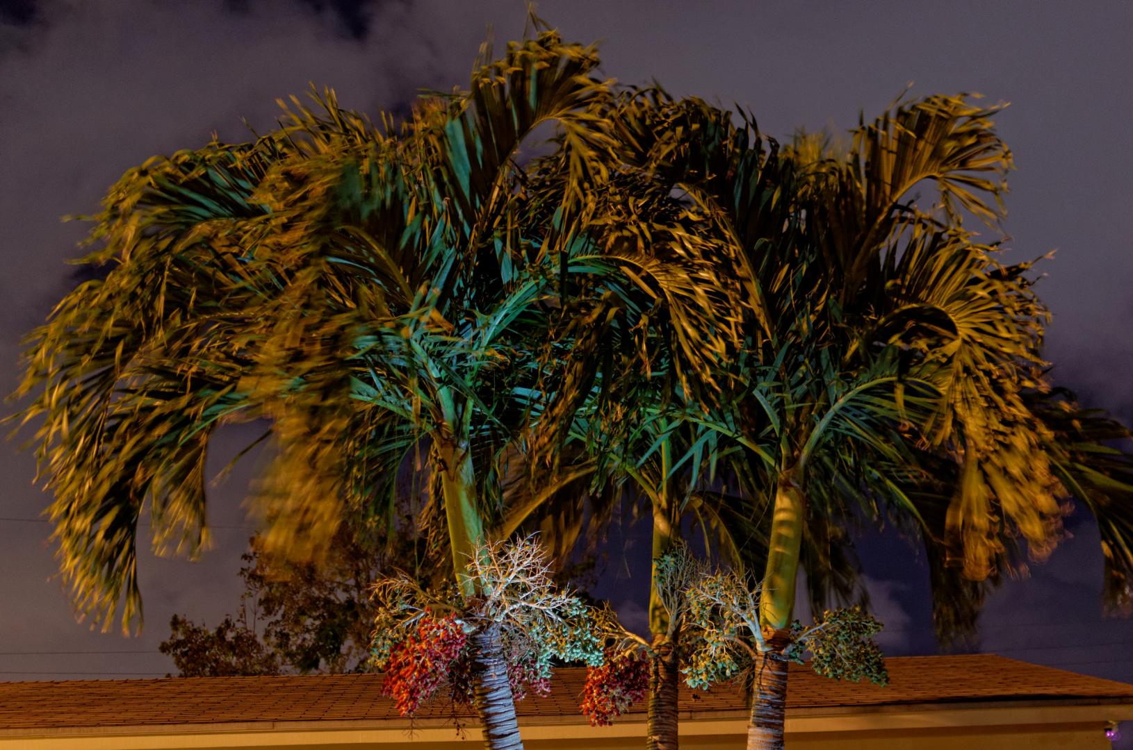 If I wanted to catch the look of illuminated palms at night I would try long exposure photographing on a tripod.