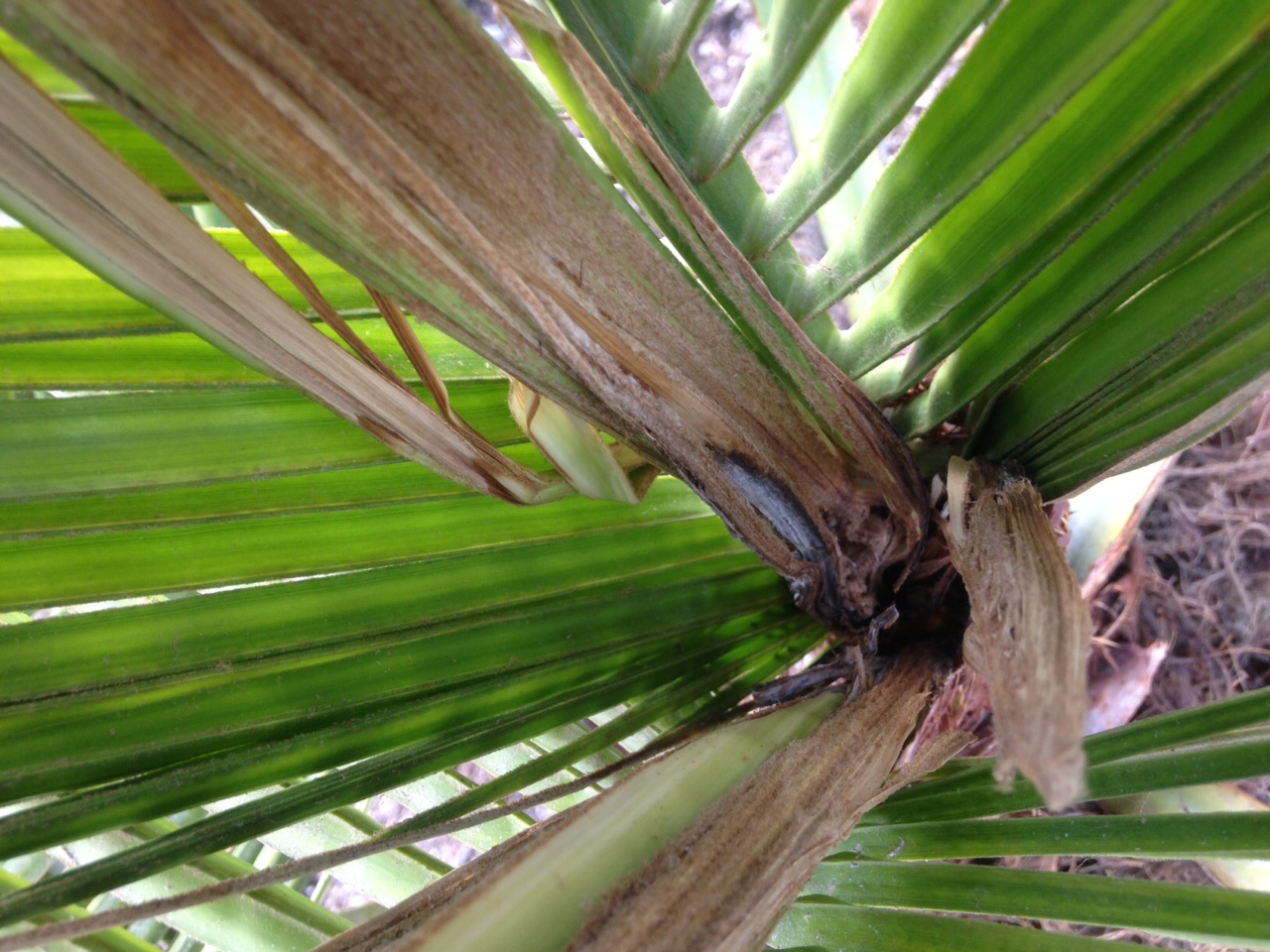 As I'm just getting into growing palms, I need some advice on what this is.  I've been spraying copper once per week in the assumption that it's a fungus.  I watered what I thought was fairly normal for a palm in sandy loamy soil in the Sacramento valley summer heat (i.e. at least once per week on micro drip).  In retrospect I may have over-watered slightly and exacerbated any pre-existing fungal condition for example... although it seems unlikely I was way off base as I have other palms on the property, all doing well.