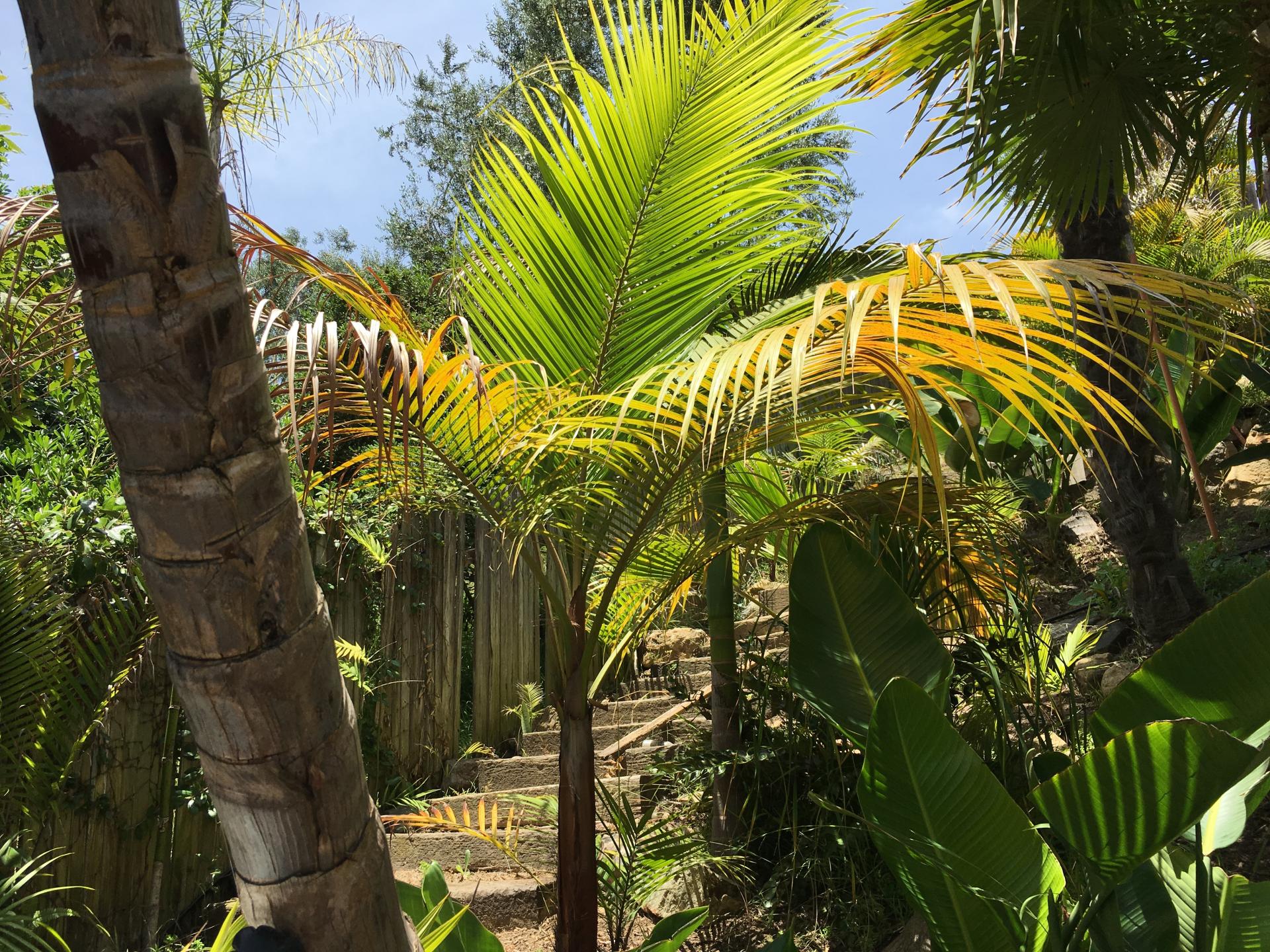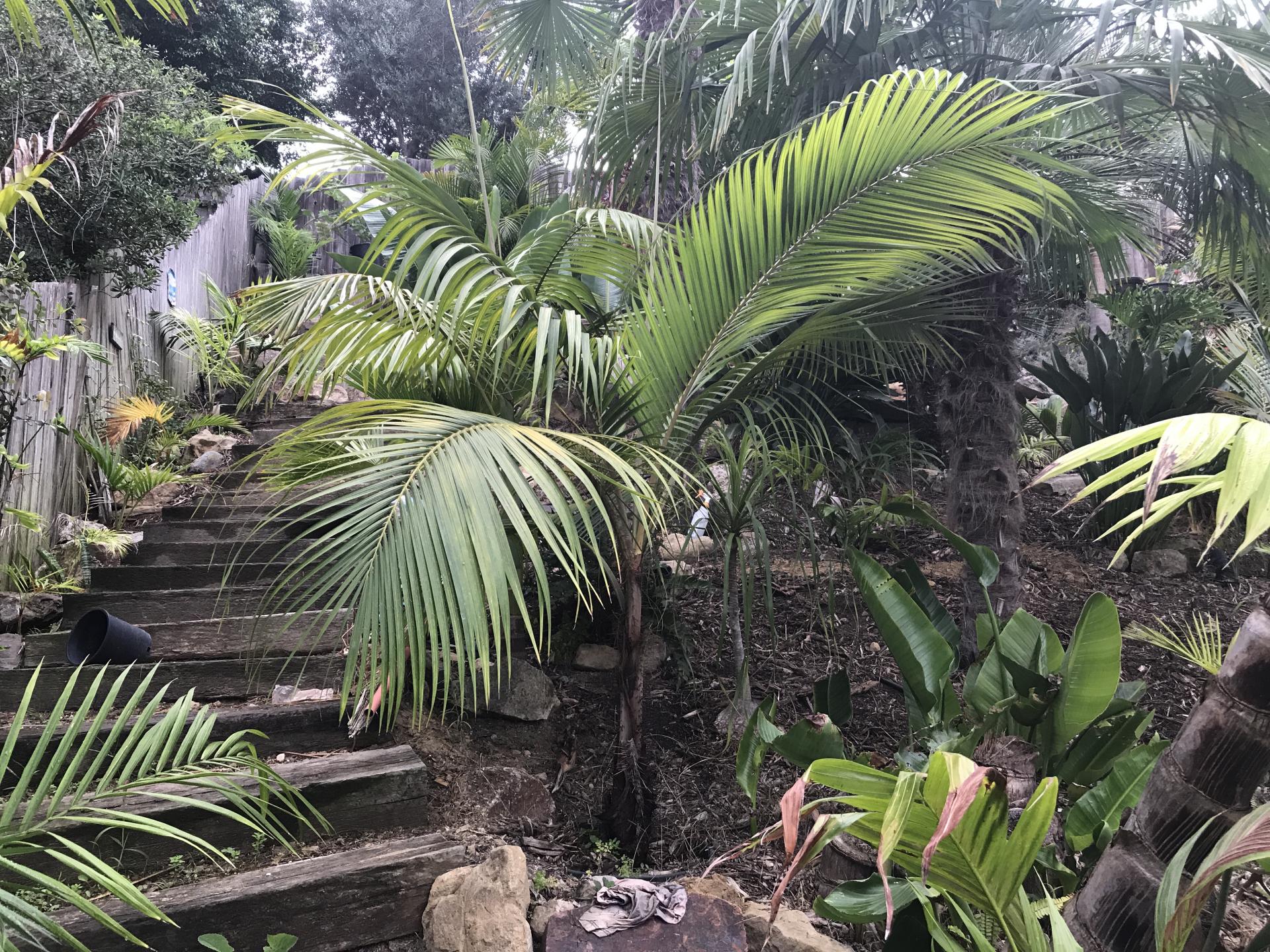 Still chugging along just fine Dave. About 8' overall & getting its first ring of trunk. I'm amazed, given all the trouble I had early on, how easy they are here. Here's a couple quick pics from this morning. Still one of the fastest palms in the garden.