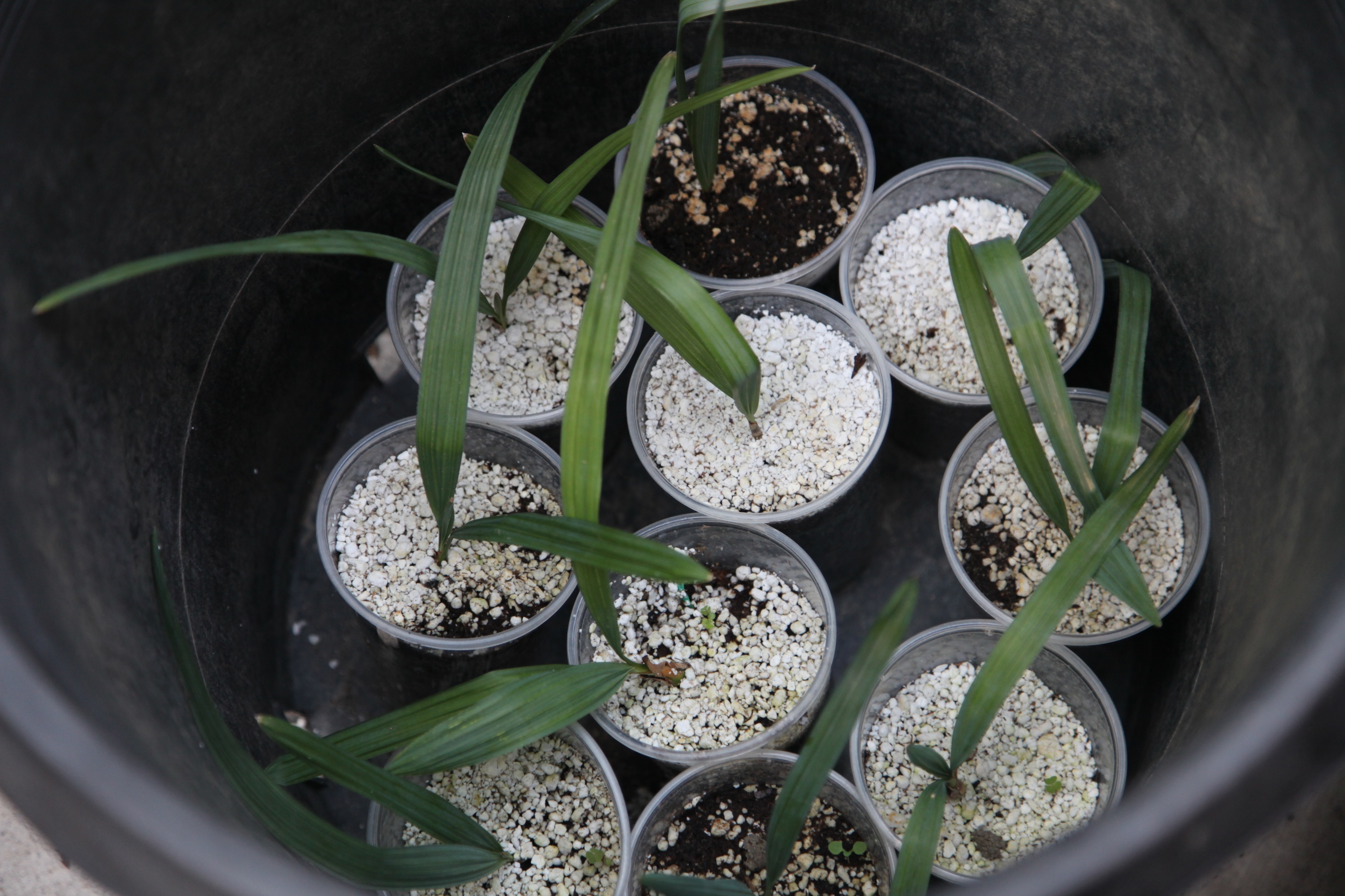 And finally, here's a row of different seedling species (they all look pretty similar at this stage).  Left to right - Yapa, "Riverside", Casuarium X Palmetto, Etonia, Minor, "Blackburniana", Bermudana, Mauritiiformis.