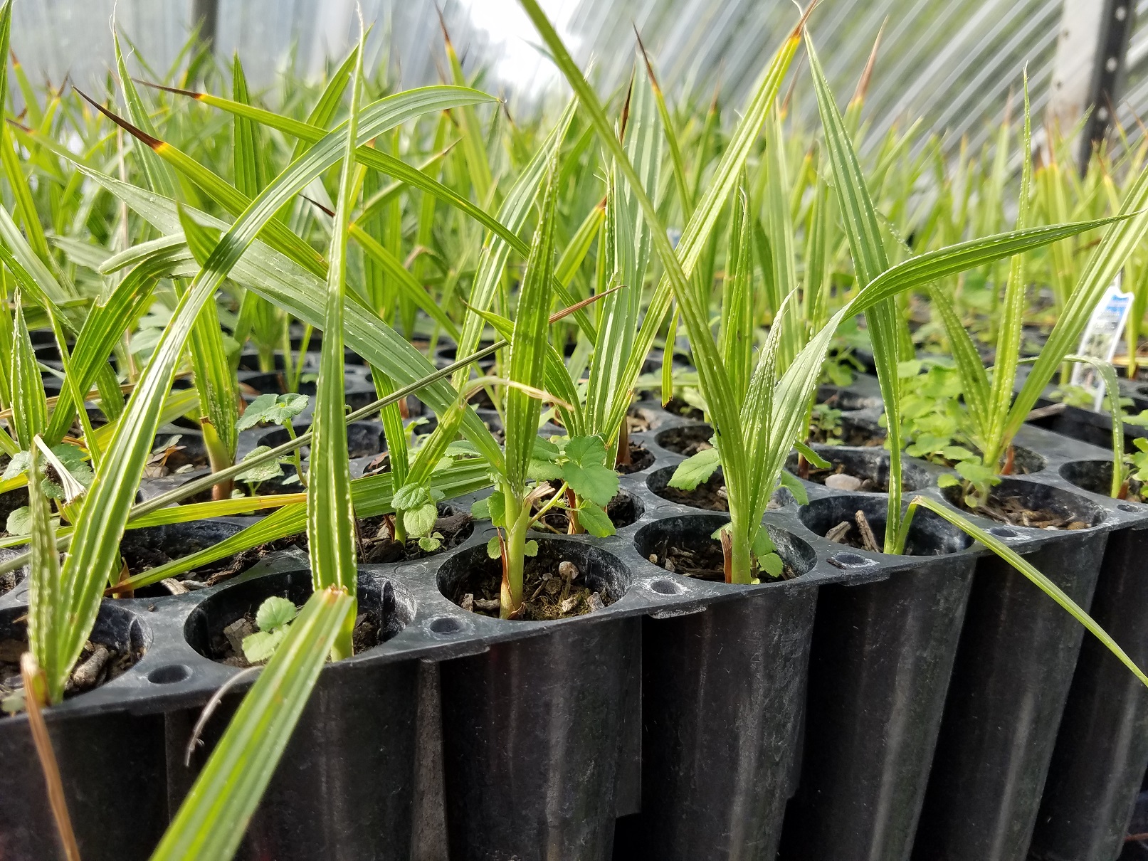 Not 100% of the straplings are pure green/yellowish.  A few percent will have a hint of brown and a smaller amount will have red/purple streaks. However they lose all of that color by the 4-5th frond.  I have done a few tests and based on that information Filifera is one of the few palms that I grow in 100% sun (let alone will live here in 100% sun) right from the start instead of under shade cloth. (Sabal uresana is another, but mostly for color)  A higher percentage of 100% sun grown seedlings will exhibit more brown, but it appears that it is due to the fact that they are more compact and the fatter trunk rips even the first petiole causing it to brown at the bottom and sides.  By the time they start to trunk I think the extreme pressure of the expanding trunk causes the sides of the petiole base to die and brown as well as the middle where they rip in half.