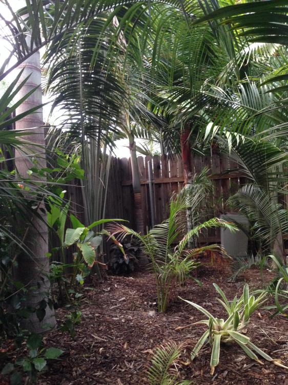 this other photo is taken from the second floor of my house. You can see the attalea leaves to the right of the foxy lady, just as tall and no trunk yet. You can see the 6 foot fence down below for scale. This photo was taken 6 months ago and since then it has pushed another larger leaf. One of my favorite palms in my garden.
