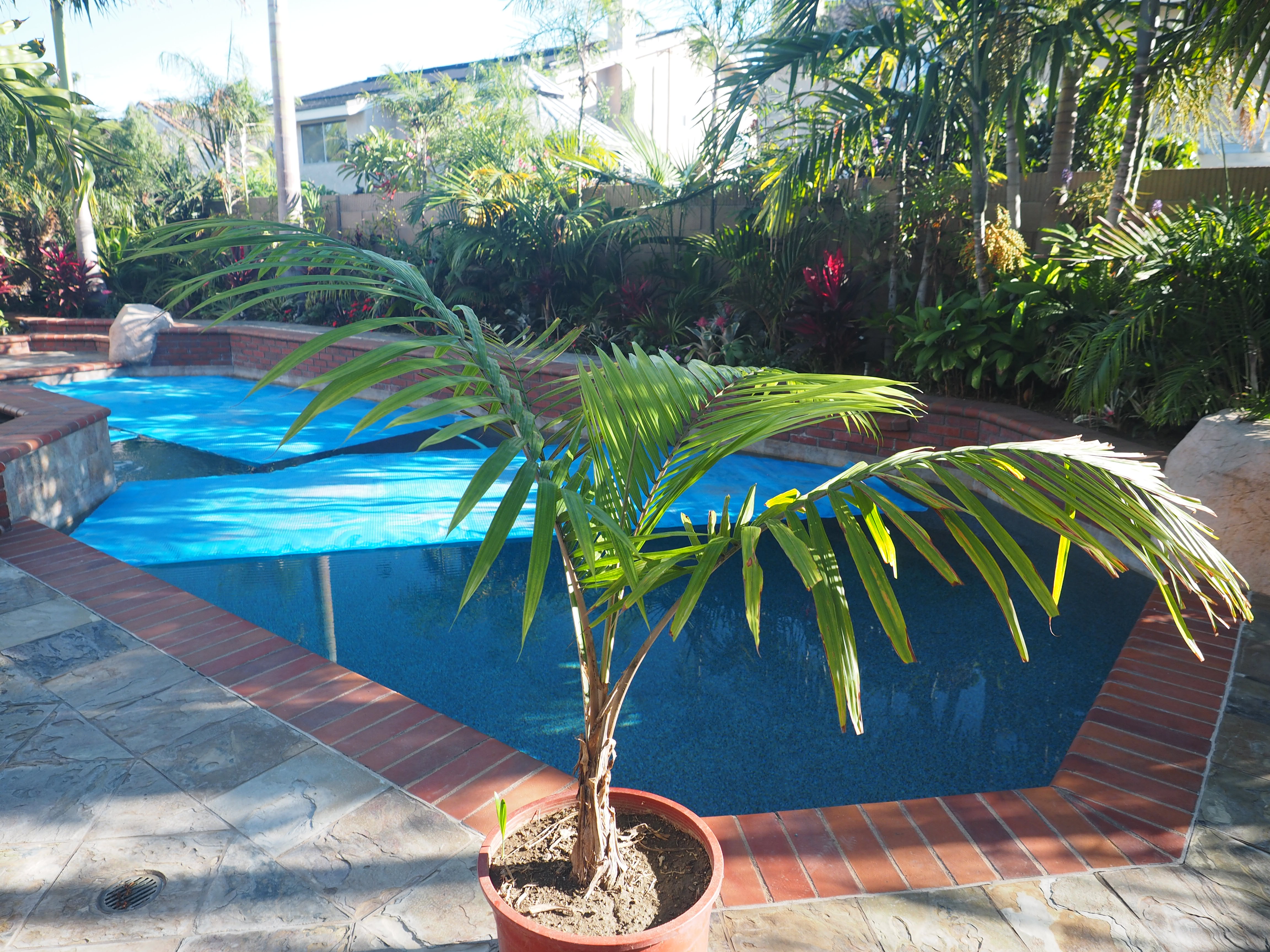The garden is over an acre in size and includes some 140 species. However, the goal has been to create a tropical landscape more than a collection of palm trees. There are several water features and winding paths that lead to a tea house, a five-tier waterfall and on to a king palm forest that honors the memory of Warren Dolby, an early champion of the Palm Society and its research/publications.