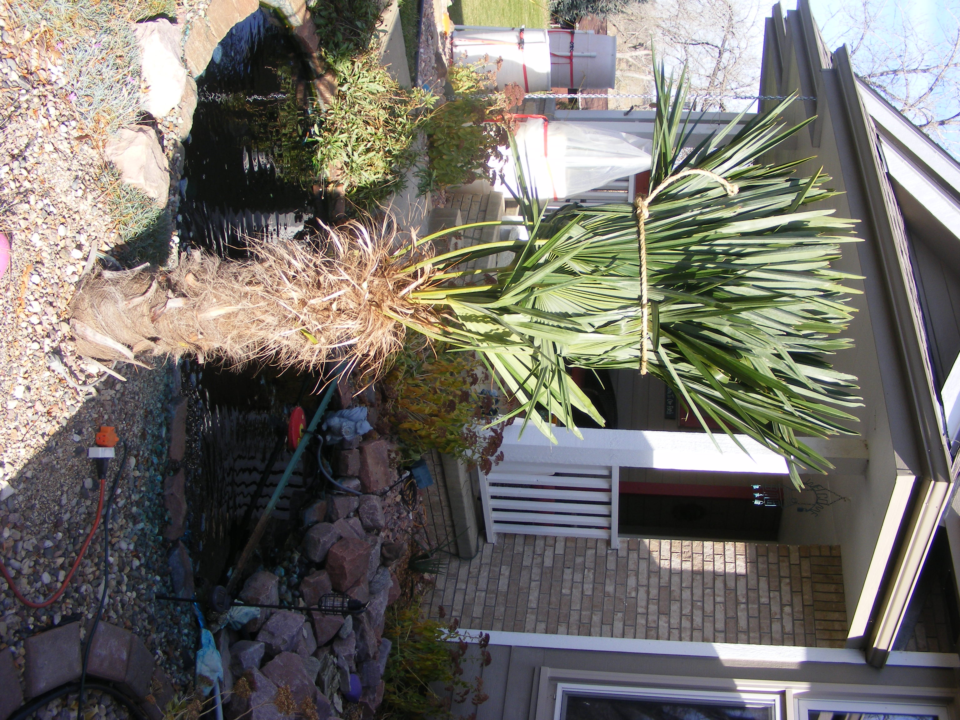All (7) of my windmill palms, 1 waggie, 5 Sabal minors and 3 European fan palms will have similar protection. Small in the ground palms will have simple large rose cones and mini lights for protection and a couple will have pop up dome type green houses with mini lights inside.