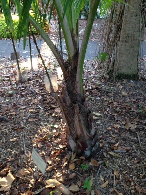 Unfortunately I can't crop the Corona palm image on this machine. So I'll post the full image. After that, I'll post two images of a yet unnamed variety of the species Beccario growing in the Sydney Gardens. Only seven years old, the first image is of the complete plant growing under a canopy of other trees. The next one is a close-up of the base of the palm. The base and trunk of this Beccario look very similar to the same of the Corona specimen.