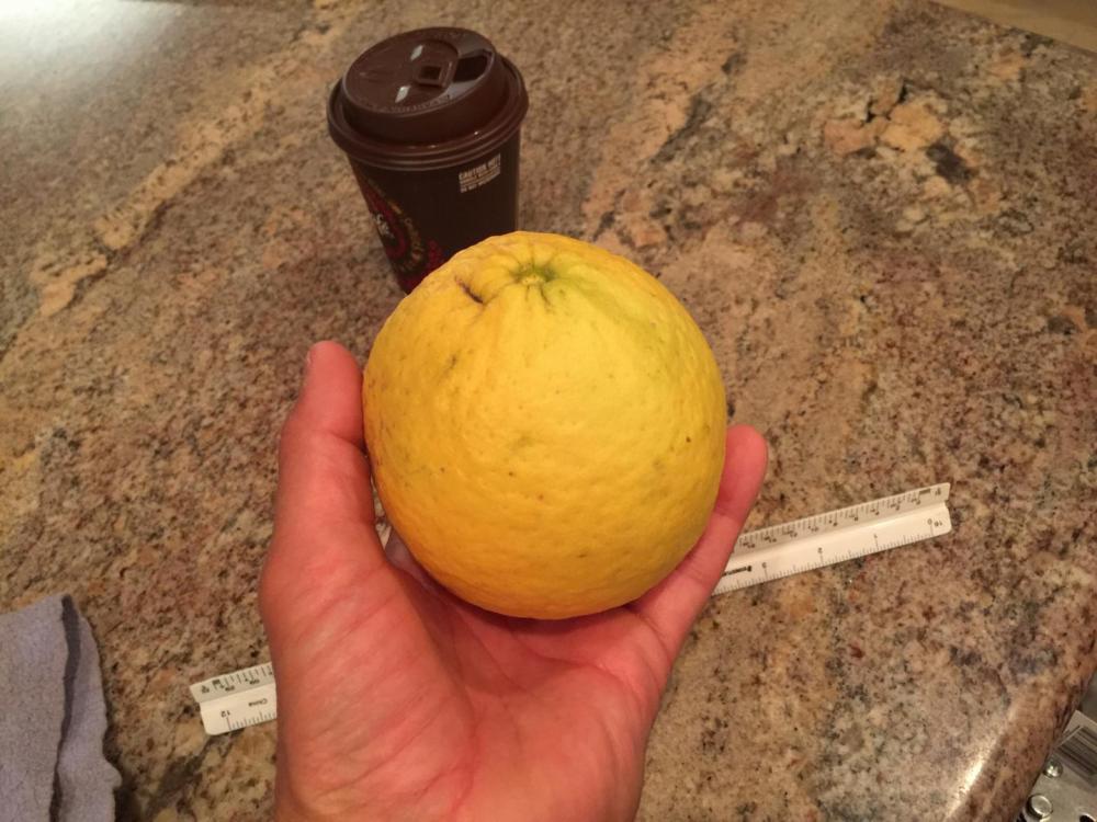 The foliage!!!!!  Oh right!  The foliage is completely green.  The first thing I checked is whether or not this was a root sucker but I couldn't see any graft line. I did see what I thought was a root sucker that had been cut off years ago but now I'm thinking that was probably the original tree. Ok so this tree is a root sucker. I always heard citrus root stalk was trifoliate orange which from what I understand produce small bitter fruit. This tree produces huge juicy lemons as pictured above.  New mystery.......go.
