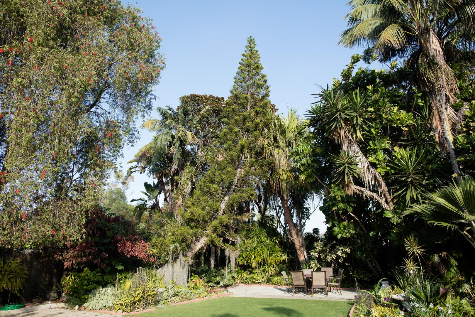 The large leaning Auaucaria in the center is what I wanted to ID.  I was guessing Araucaria columnaris?  A friend is moving into this home in Encinitas and was asking about some of the plants in the garden.  Some nice orchids mounted on some trees in the garden too.  A few palms, but pretty common stuff albeit some are mature (Dypsis lutescens, Rhopalostylis sapida, not in this photo and some of the Howea's you can see in this photo).  If I'm wrong on my id, or correct, let me know so I can pass along to the homeowner..... thanks in advance for the responses.