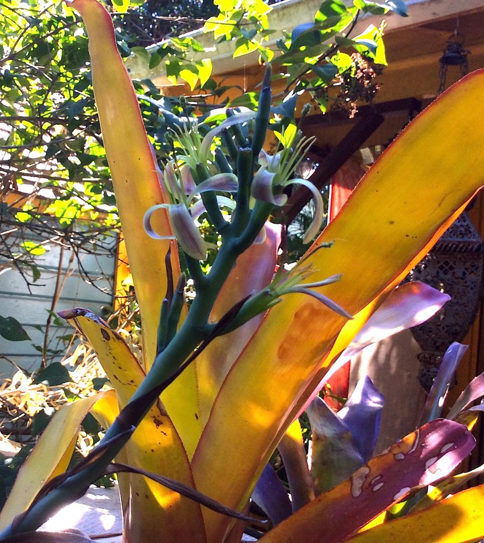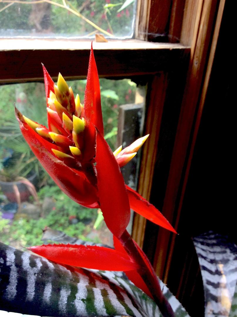 Aechmea chantinii cv. 'Black'  brought inside to enjoy the flowers.