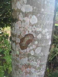 This Foxtail has had some slight damage to the trunk over the years , and is still growing well . Lots of lichen and moss on it  , like most plants here in the wet tropics . Seems to be a layer only a few mills thick .