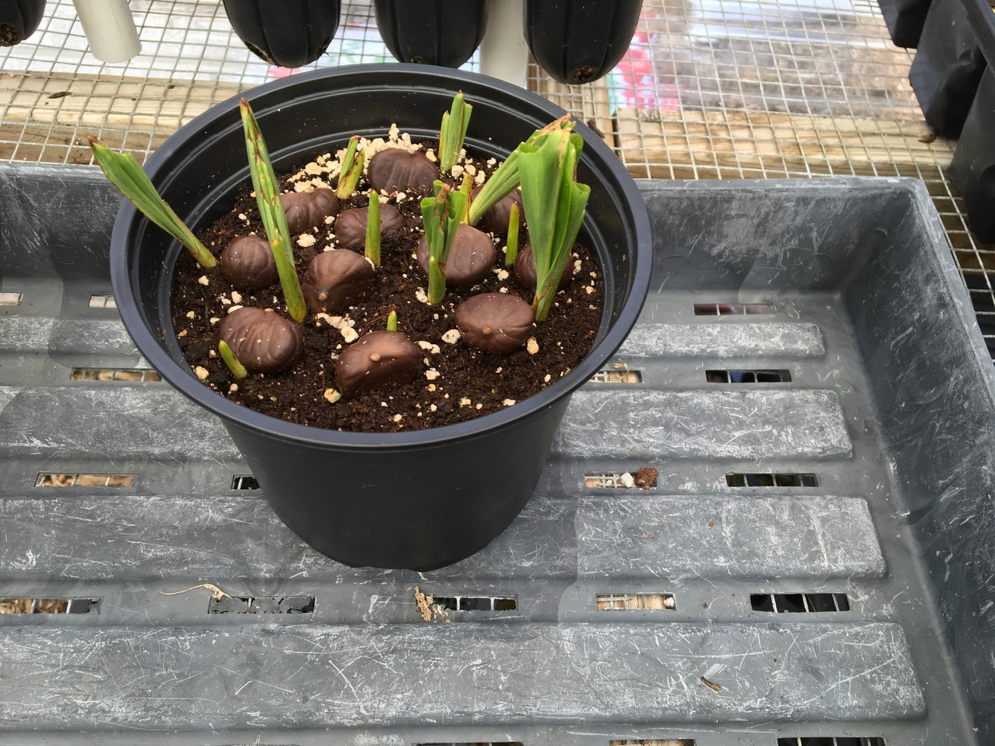 Yes, in the summer. In Winter the baggies are inside the house on a heat mat. Once sprouted seeds have enough roots in the baggie I transfer them to community pots until they are big enough to plant in their individual seedling pots. Here's some Caryota no after they have been transferred, and growing for a while. Soon they'll be ready to pot individually.