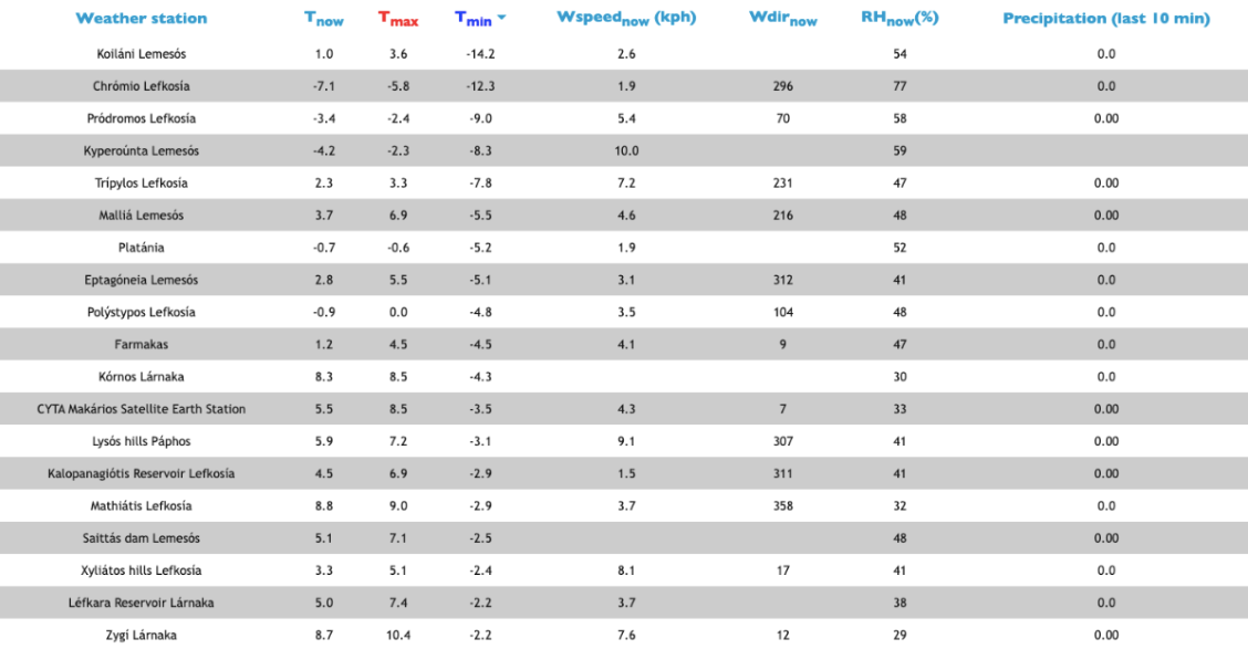 Here is a list of the lowest Ts in Cyprus on the 23rd of Feb 2025. Note a new national record of -14.2C in Limassol area (at 840 m altitude).