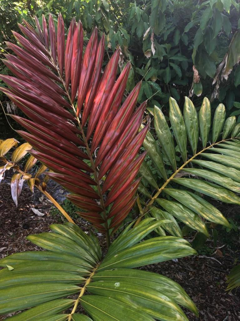 The C macrocarpa "hookeri" form is even attractive when not throwing a new red leaf in my opinion.  Not the same structure as it's close relative C "houailou", but still a graceful palm with those wide leaflets and interesting trunk color.