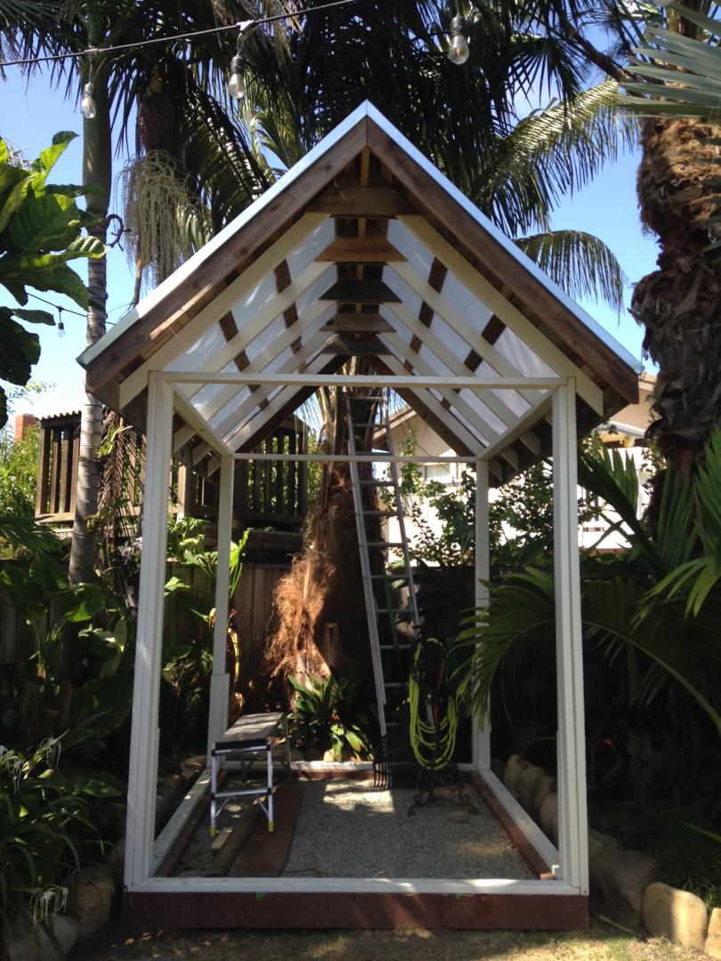 I've finally gotten around to framing out my small greenhouse.  I thought I would share the progress with all of you.  It is about 7' x 9' and 12' tall at the ridgeline.  I have procurred old windows and a door from a tear down in Laguna Beach.  THe house I got the windows from was built in '29 BUT I believe these are new old stock wood windows.  Regardless they have a great retro vibe to them.  I'll post pictures of those next time.