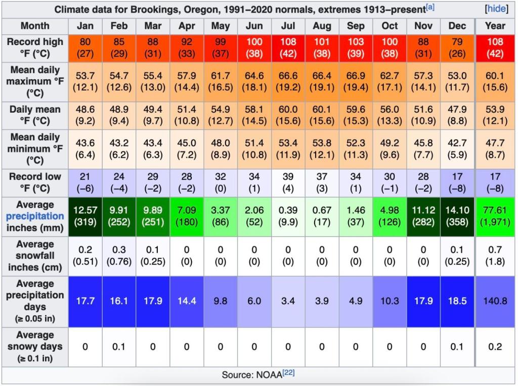 @Alex High I'm not an expert on Brookings, but I have been there.  What I can tell you is that you have to go a long way south into California to reach temps as mild.  Northern Coastal California is colder.