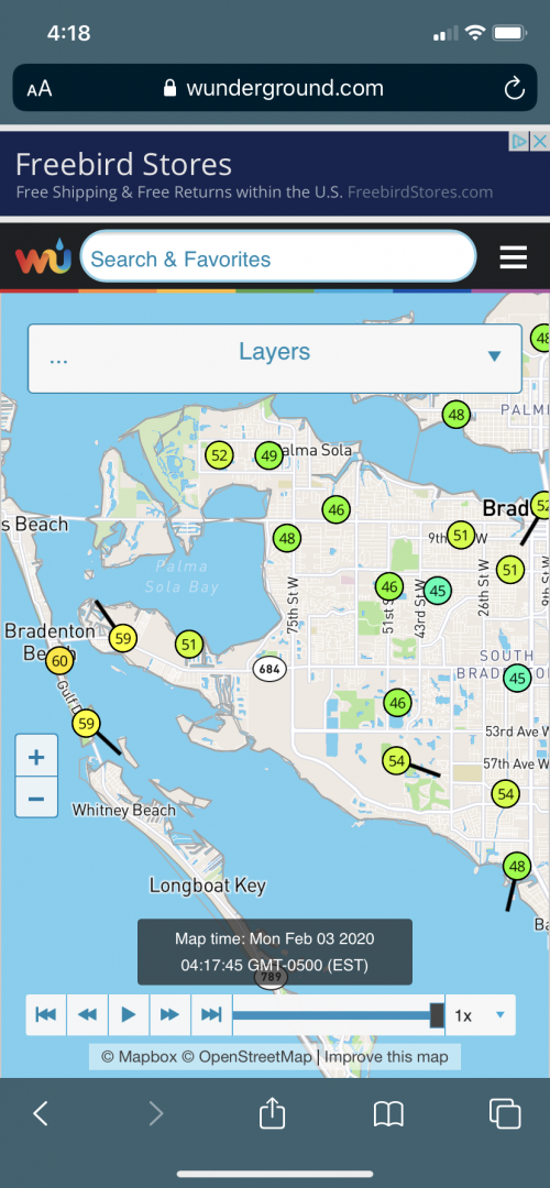 Curiously the warmest place on the whole west coast tonight is Bradenton Beach (not AMI, not Naples, etc.) 3 stations are all around 60f while it’s in the mid 40s a few miles inland.