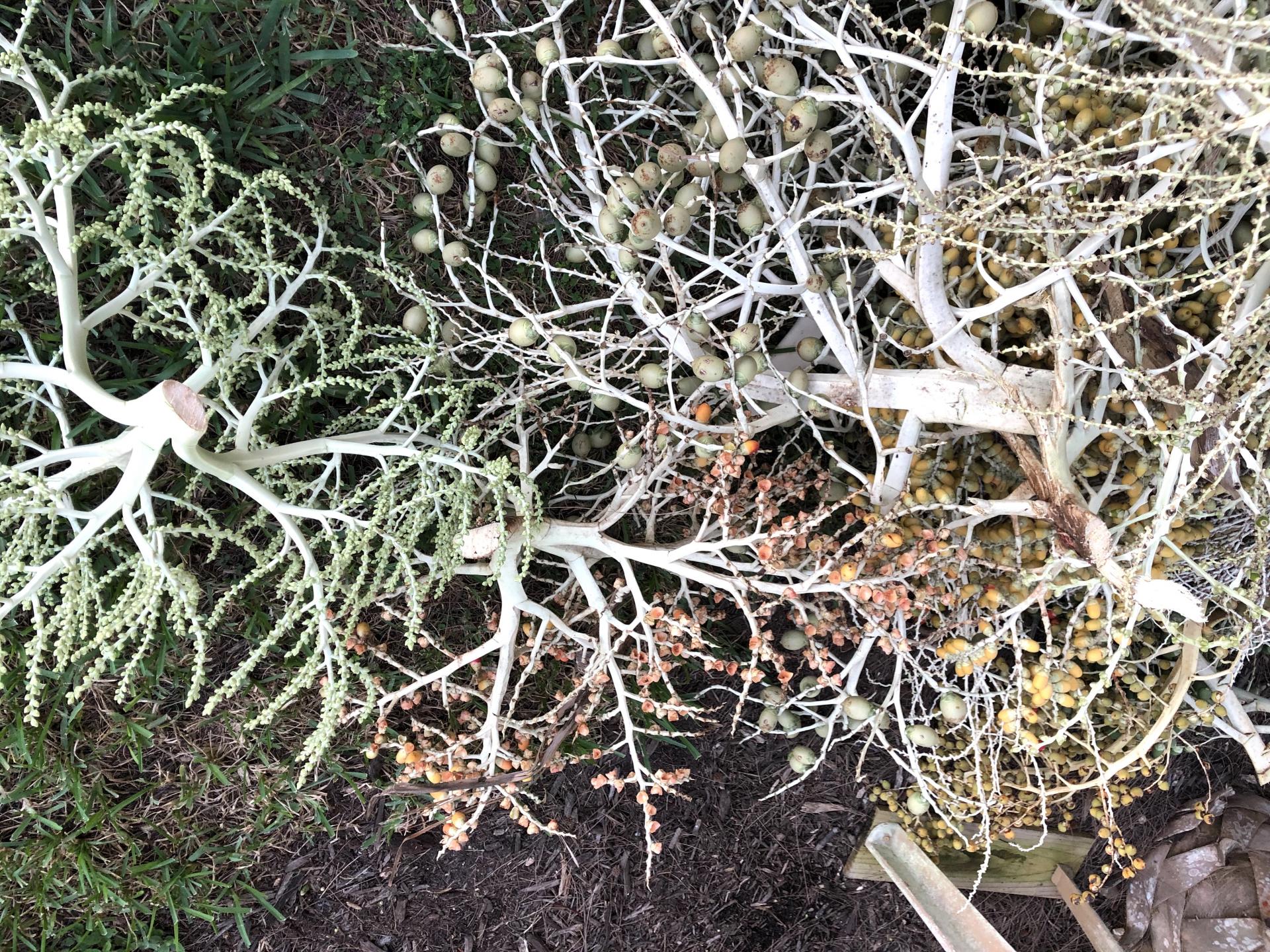 I have many palms. Most of them are very happy palms because I love them and we treat them well. In turn, they reward us with bountiful crops of seeds. I've learned there is scant interest in seeds of very tropical palms, esp. "common" ones that grow fast and get large no matter how beautiful they are. Today we got out the pole saw to stop these palms from burying us alive in seeds. We ended up with the pile of aborted infructescenses you see in the photos. Sad, I know, but necessary.