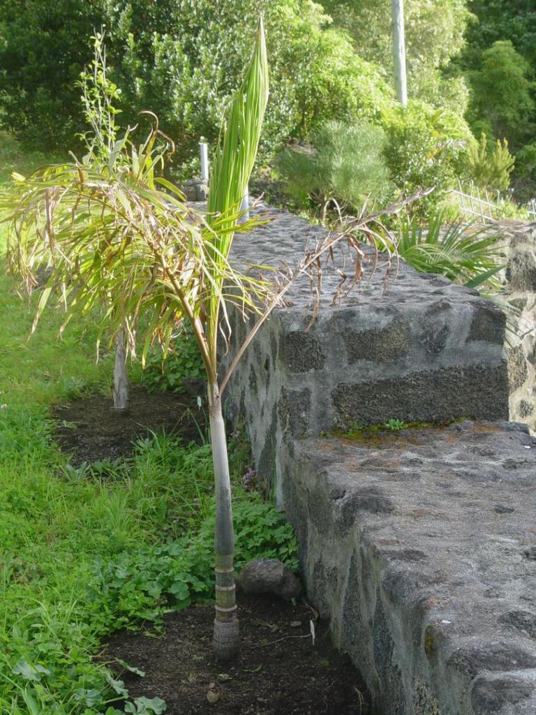 I believe this is Veitchia montgomeriana. It is growing with me for about 5 years (from a nursery-bought seedling), but only a couple months in this spot. The rest of its time it was living in a black nursery container. The location is Pico island, Macaronesia.