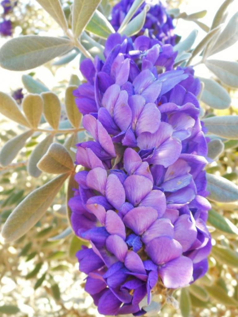 A sure sigh that spring has arrived here ..and ( more so ) in Texas.. occurs when the scent of Grape Soda starts filing the air.  Smelling it, eyes start wandering, looking for the source. When found, attention quickly turns to the spectacular cascades of purplish blue Wisteria-like flowers smothering tropical-looking, dark green pinnate, glossy foliage.. While some might assume Texas Mountain Laurel, or Dermatophyllum secundiflorum ( Previously known as Sophora secundiflora ) would originate some place warm and wet, this tough Texas native originates from some of the hottest and relatively dry portions of the state, and adjacent Mexico. Many parts of this region of Texas get quite cold in winter as well.