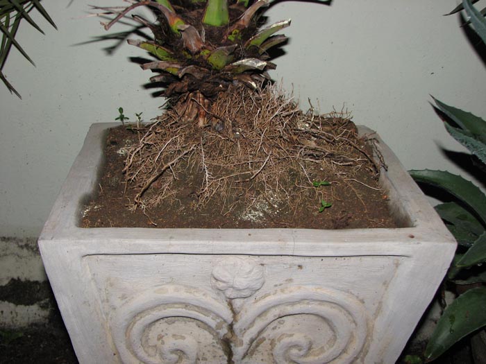 After getting the palm back home  (Virginia Beach, Virginia) we discovered that the palm is badly root bound (2/3 of the pot is dirt w/roots, the last 1/3 being just roots growing in a circle around the pot) with an empty spot in the middle.