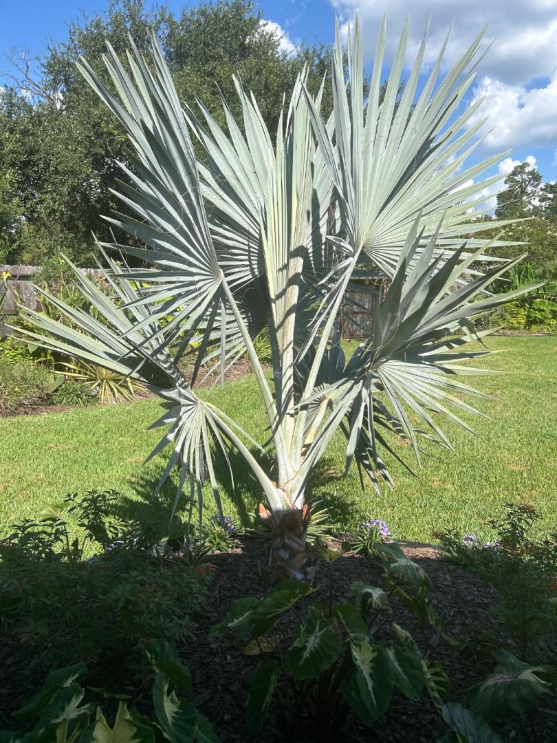 Aquí está mi propia Bismarckia en Mississippi. Esta aún no ha pasado el invierno, pues la planté hace tres meses. Pero tengo dos más, de la mitad de tamaño, que sí pasaron el invierno pasado con medidas de protección deficientes y sobrevivieron.