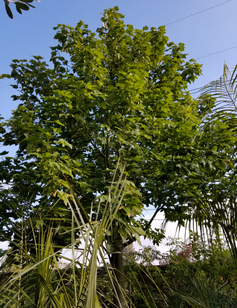 For comparison, here are two of mine in pictures taken today. The first image below is my Brachychiton discolor that's scarcely dropped a leaf despite quite a few nights this month in the low 30s where I am in central NorCal. It bloomed for the first time this past summer. The second image is my Brachychiton acerifolius that also has stayed green despite the low temps. It's not yet bloomed for me. I'm 'using' both trees as quick shade/shelter for more tender palms and other plants below them.