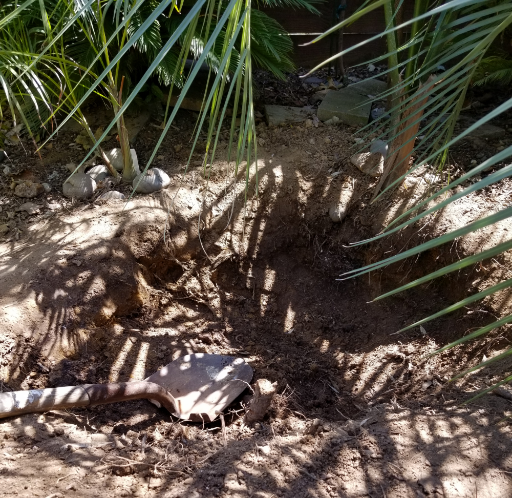 I have disposed of the remains of my Brachychiton discolor that fell during a recent wind storm. A somewhat arduous, time-consuming task to accomplish with hand tools, but I managed to chop up all the branches and dig out the trunk of this +15yr-old tree. Really sorry to see it go (it was a 2-in. seedling when I bought it), but I already have a replacement to plant in that spot to create overstory shade for the adjacent palms, incl. Dypis onilahensis (L) and Kentiopsis oliviformis (R). My soil is a layer of soft clay over dense hardpan.