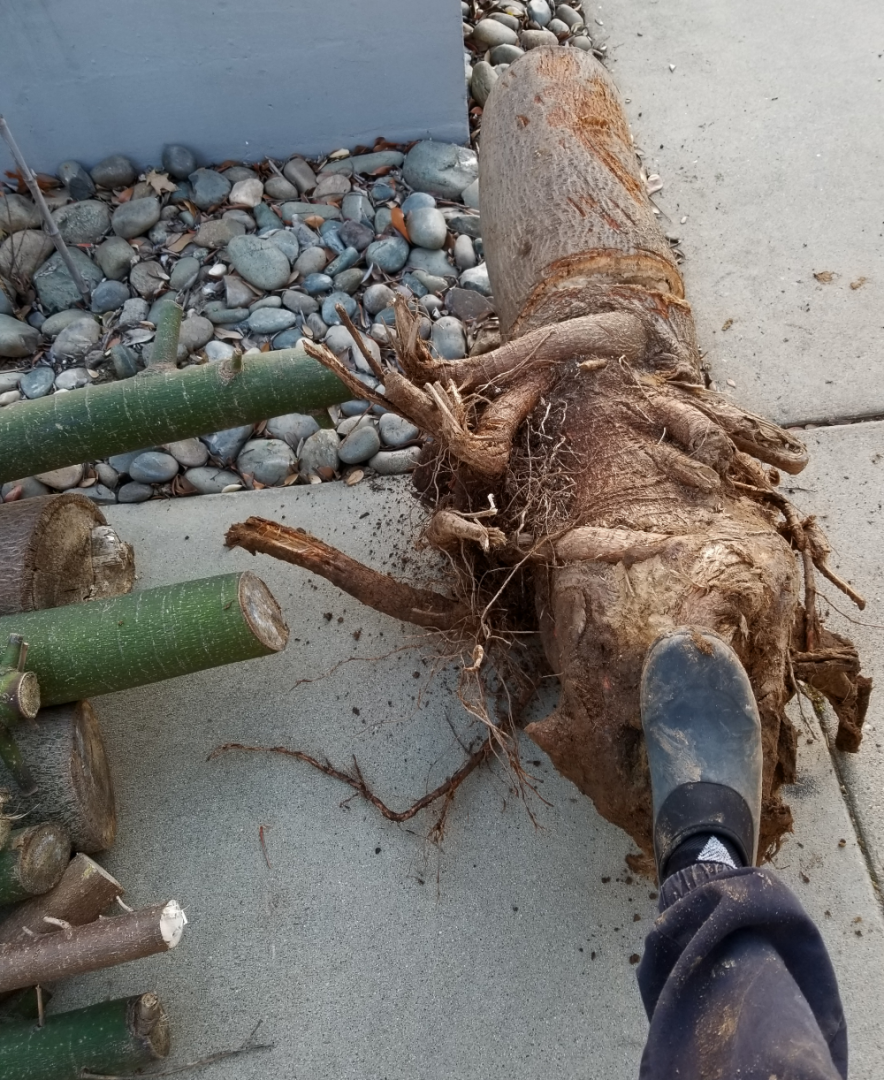 Winter storm "Orlena" here in NorCal had a major impact on my backyard last night. Lost this Brachychiton discolor from the high winds.  The wood was so soft I was able to cut it up with just a little handsaw. I think part of the problem was it'd spent too many years in a pot and the main roots were wrapped around each other when I planted it. At least my B. acerifolius is ok, so far, but the storm isn't over yet. The only good thing about this is space has now opened up to plant more palms!  :rolleyes: My palms handled the wind well, except for a Parajubaea torallyi torallyi that leaned a bit.