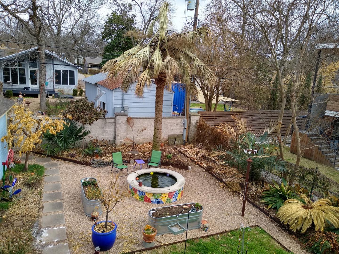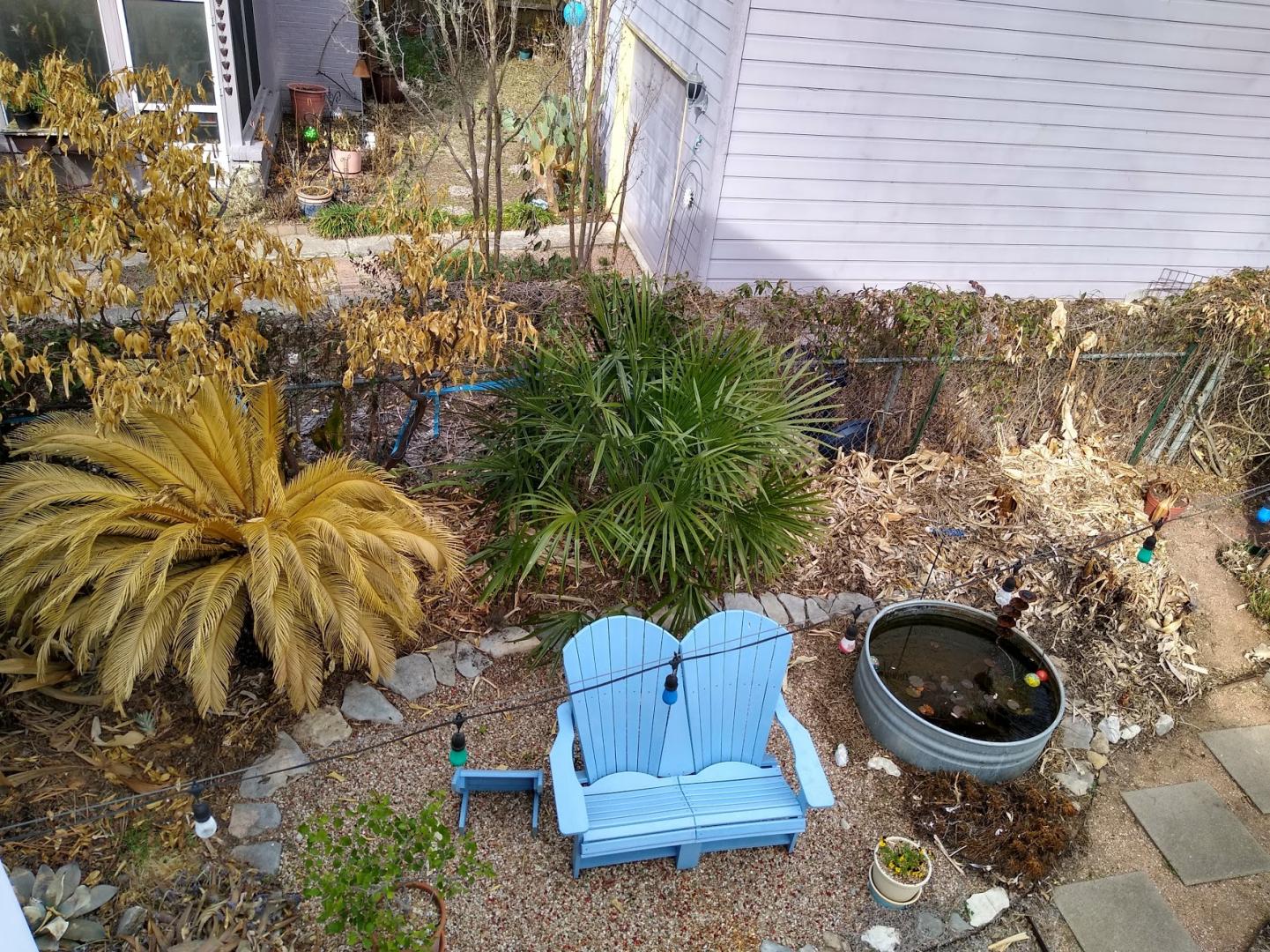 • Sabal mexicana (the tree) : Leaves badly damaged.  The browning is due to the cold, but the bent and broken petioles were caused by heavy ice accumulation from freezing rain.  We had more than 1/4 inch of it sticking to everything in my yard.  You can't tell from this picture but the new leaf is pushing out the top with green at the base, so I'm hopeful.  I grew this tree from a seed I picked up off the ground 29 years ago at a nearby park (Mayfield) that has many mature specimens.  Most of the others I see around Austin have the browned leaves, but I think they will all pull through.