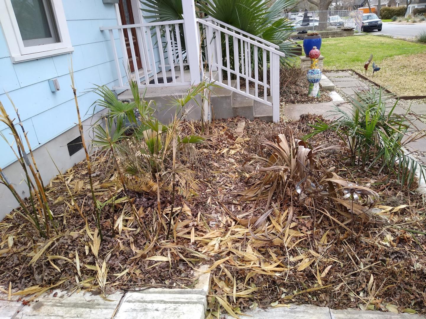 • Chamaedorea microspadix clusters (left front, and another by the porch):  Three clumps in front were protected only by a beach umbrella (not much protection in this case, but it did keep the ice off of them).  All of the stalks are of course defoliated, and none of those stalks is pushing the spears at all.  I presume those stalks are goners.  However, all of these plants already have new green leaves emerging from buds at their bases.  They have never had any freeze damage since being planted here (3 years). I think they will all recover.  They seem to grow pretty fast when conditions are good.