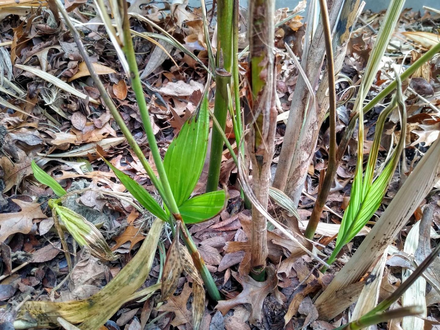 New leaves emerging at the base of a Chamaedorea microspadix whose tall stems were all killed by the freeze.  I applied no protection at all on this plant.  There was already a layer of oak and other leaf mulch about 4 or 5 inches thick, though, which might have helped these buds make it through.