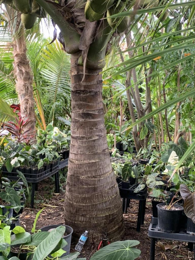 My late Dwarf Red Spicata Coconut had a base ~30" in diameter, the fattest I'd ever seen on a Cocos.