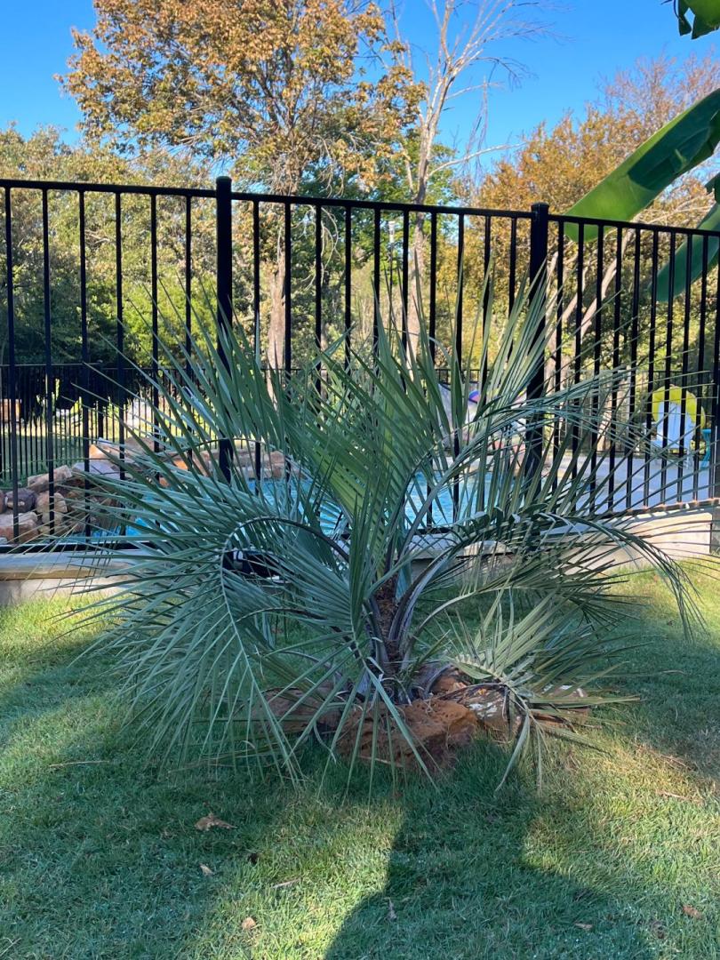 Trachy Fortunei that had no protection, no spear pull during '21, blue java banana(s) in back, and sabal birmingham peeking from the right of the column in the flower bed  There is a very small S. Minor planted in that same flower bed blocked by the column.  I planted it last winter, and it saw three days of 18F cold, iced over, frozen, wetness, and took off to put out three spears this year.  Most Sabals are so tough, and even in NTX can be planted year round.  Don't listen to old logic.