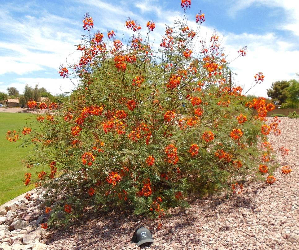 Note that there are two forms of this species in general cultivation--one with light chalky-green leaves and fairly wicked rose-style prickles placed intermittently along the branches...this is the form that is commonly found in the tropics and in warm, humid subtropics such as Hawai'i and Florida, and includes the common red/yellow and pink forms, and if memory serves also the yellow form ("flava"). It is not very cold-hardy and rarely returns from the roots in the Deep South after long, hard freezes. The other form, which is commonly grown in the southwestern states and eastward through Texas to the Gulf States, has glaucous (blue-green) foliage, a less distinct color-break between red and yellow in the flowers, and as far as I know has no color-morphs, at least none I've ever seen in general cultivation. Notably the stems lack the rose-style prickles, which have been replaced along their length by many stiff, appressed hairs that with age become bristle-like (and can also cut you up a bit). And it is notably drought-tolerant, evidenced by its usage by the millions throughout the southwestern deserts. It also returns easily from hard freezes in marginal areas, and I have always assumed this is the form native to the state of Sonora in Mexico...the species having a somewhat blurry natural distribution but confirmed from Sonora and also Central America.