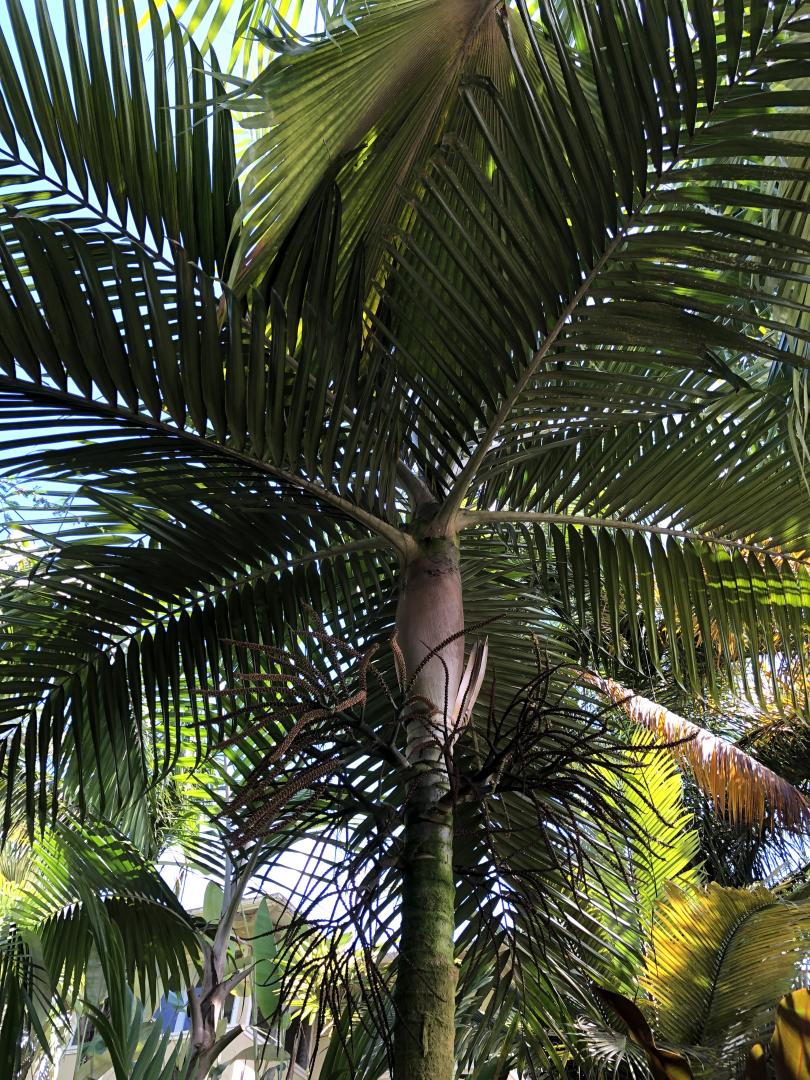 Such an elegant palm especially when it discards an old leaf sheath. Had a bit of cover when it was young, but now gets much more sun. B. vieillardii, hapala, and grandiflora all seem to have similar growth rates in the garden.