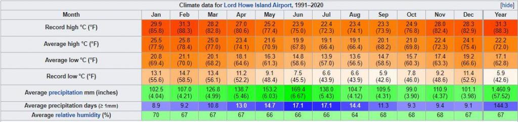 " Lord Howe Island has a humid subtropical climate (Cfa under the Köppen climate classification).