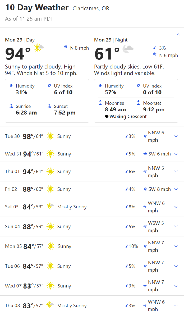 @Jesse PNW you haven't been above 90 yet?  I think the hottest we've been so far this year was 99F, we've flirted with a 100 a few times.  Todays a little cooler at 88F, the last couple were about 95F.  We were pretty late to get hot this year but the last 4 or 5 weeks have been pretty solid.  Grass is fried, but it's lasted longer than I've ever seen.  The Gorge is colder than my location, the growing zones drop the further you get in.