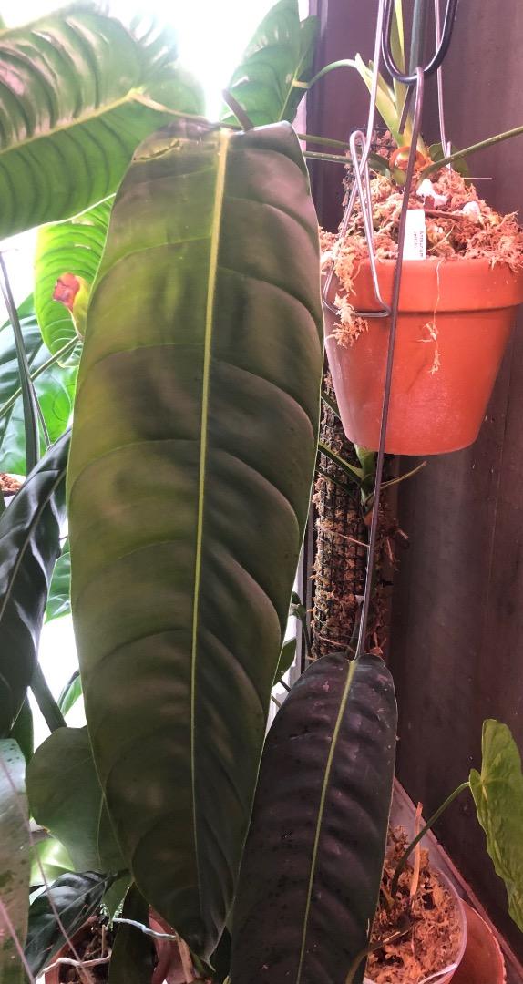 Going into autumn this might be the last big growth push on these young philodendrons until next summer.  My P.  patriciae just put out a 23” leaf. The texture is so satiny smooth.  Beyond what I imagined this plant would look like “in person.”    Photos with hardening new leaf of the Anthurium veitchii suspended above.
