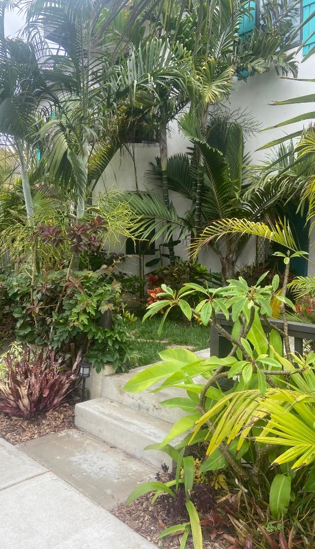 GARDEN NO. 1: The home and garden of Gary Wild at 20551 Montauk Cir. Huntington Beach.  He started his garden about 20 years ago. His yard is full of mostly mature palms including a 12’ tall bottle palm, several Dypsis, Clinostigma savoryanum, and a large Kentiopsis oliviformis and many others, most nice and tall (give yourself something to look forward to if you have a new garden).