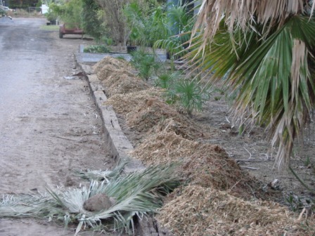 mucho mulch, i  am trying an experiment here, mulching these to beds quite heavily, I applied a broad spectrum insecticide because rhino beetle grubs can be a big problem here, it is green chips, I am not too worried about nitrogen lock because these palms get watered with constant liquid feed.