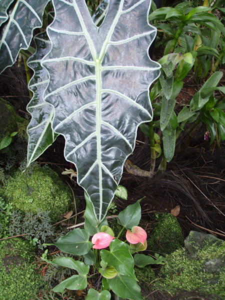 Alocasia sanderiana or Kris plant with the smallest anthurium I have seen.
