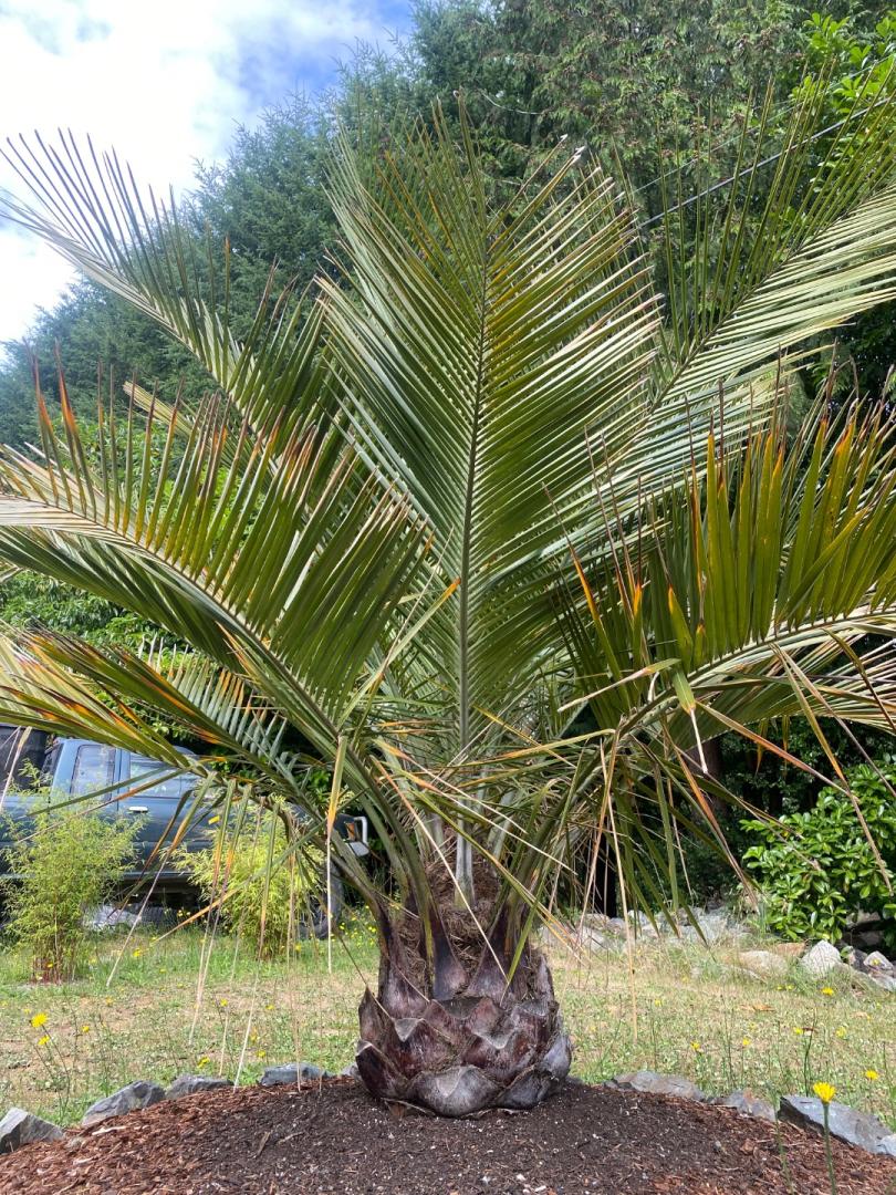 It's grown quite well. The lower fronds are yellowing prematurely this year. I know they're somewhat prone to that in the early years of development. It's now planted in an area where it's out of the late afternoon hot sun. The trunk is triple the size it was 3 years ago.