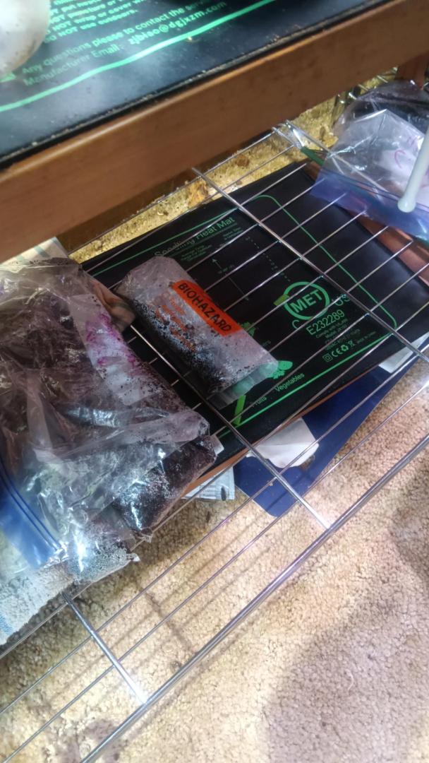 Moved the coconut to the grow room. I'm using the container from my birthday cake as my water bucket and it's in a Ziploc with just a splash of water and open per RickyBobby's videos, on the heat mat. I had it set at 95, I don't think it's actually 95 so I bumped it up a hair.