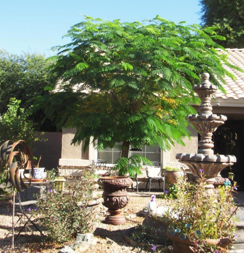 Those of you who live in Mediterranean or temperate climates but want to create a tropical looking garden, what deciduous trees do you think match this style? I am looking for a tree that will provide shade and will look tropical but have run out of ideas. Albizia is awesome but the mess that it creates is terrible. Jacaranda is great but too big for my small garden.