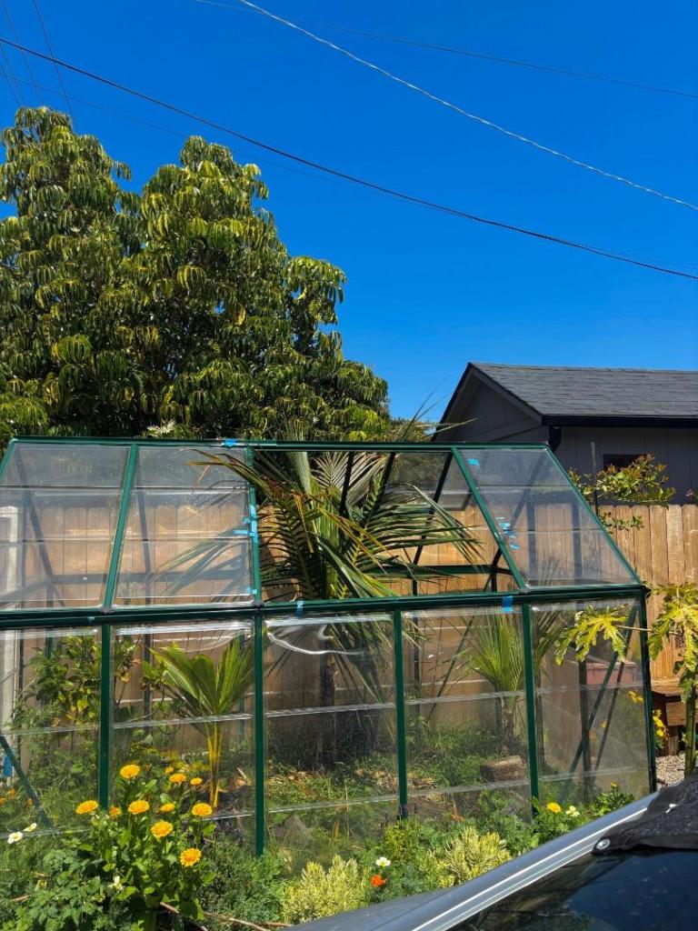 I can’t really show the size bc of all the things in the way but you can see how thick the trunk is, I can’t even get my 2 hands around it together. I have tried to cover the holes in the greenhouse to allow the temperature to build up during the day, as the coconut must appreciate it. It gets battered by the wind now that it is pretty high up so I hope it doesn’t get ugly after storms in early spring. Anyways im always happy to check this one out bc it grows so fast