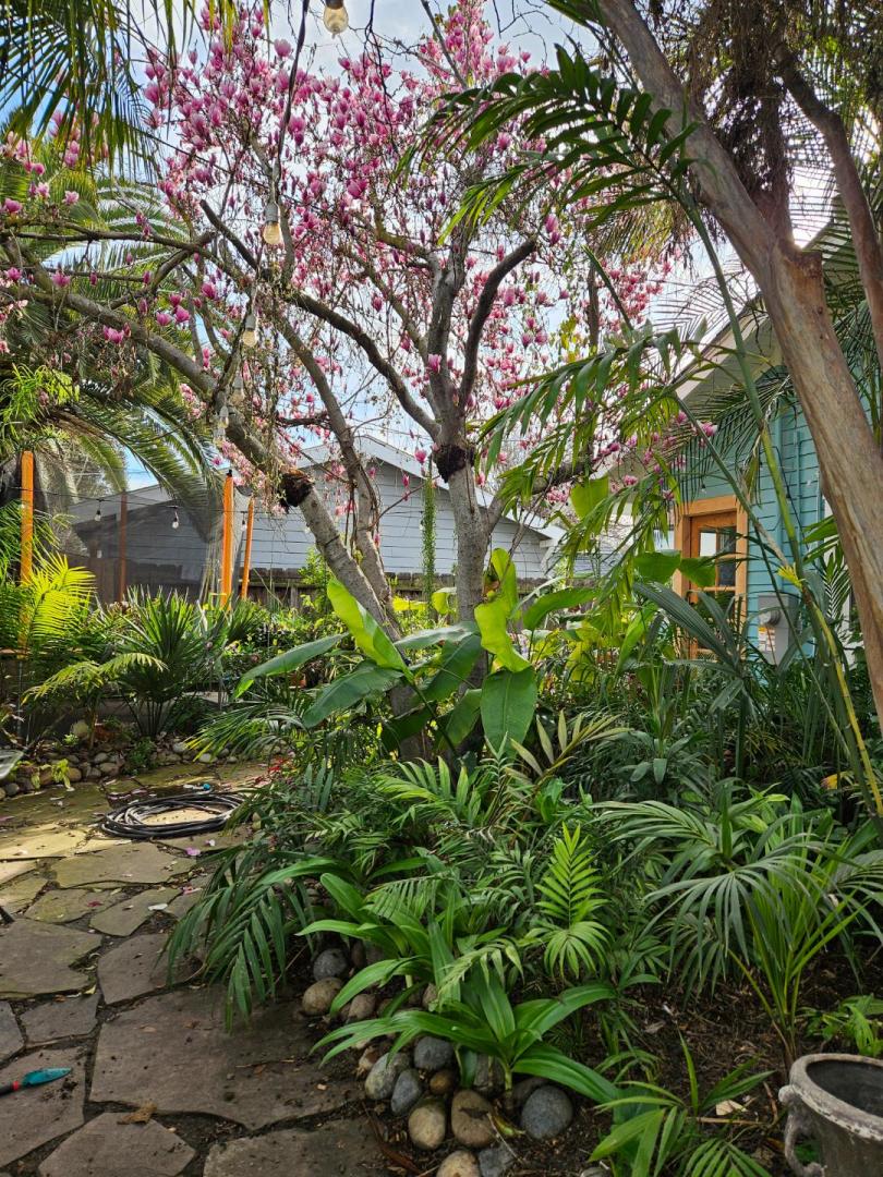 Pic from farther back. I use the Rhapis as a utility palm to cast some shade on this. I would have no problem cutting out some of the Rhapis as this ages a little more to lessen competition but I feel if I cut back its Rhapis canopy too soon it will set it back in the blazing sun.