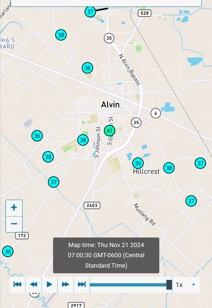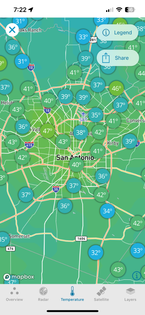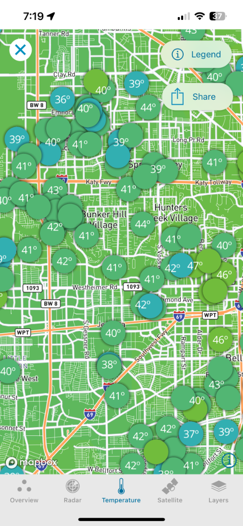 Warmest reading near town were 45-46F from the stretch around Midtown to West University Place. 42-44F elsewhere in Loop 610.