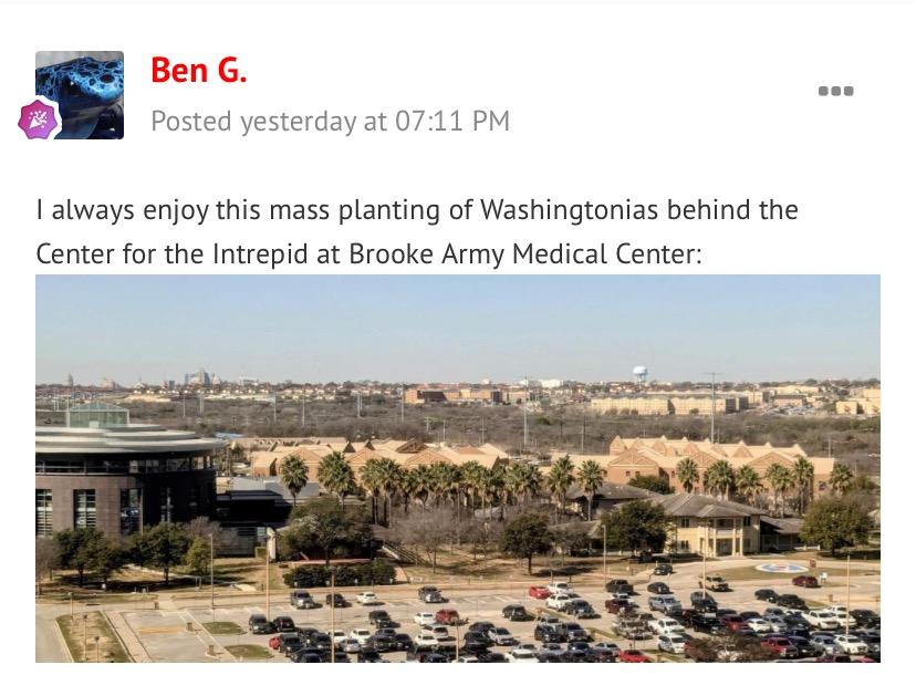 I always enjoy this mass planting of Washingtonias behind the Center for the Intrepid at Brooke Army Medical Center:PXL_20250310_1557105252.thumb.jpg.48277e285f06295e194bf81471cbf0cd.jpg